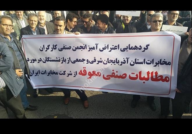 بر اساس برنامه ای از قبل اعلام شده، شاعلین شامل نیروهای رسمی ، قراردادی و شرکتی تحت عنوان انجمن صنفی کارکنان مخابرات آذربایجان شرقی و همچنین بازنشسته های این استان تحت عنوان کانون بازنشستگان برای رسیدن به اهداف صنفی تجمعی در محوطه مخابرات منطقه برگزار کردند.