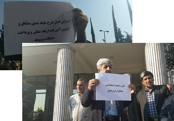 تعداد قابل توجهی از همکاران مخابراتی در پلاکاردها و برگه هایی خواسته های خود را از جمله اجرای آیین نامه مصوب سال ۱۳۸۹، تبدیل قراردادی ها به رسمی و اجرای طبقه بندی مشاغل برای نیروهای شرکتی مطرح کردند.
