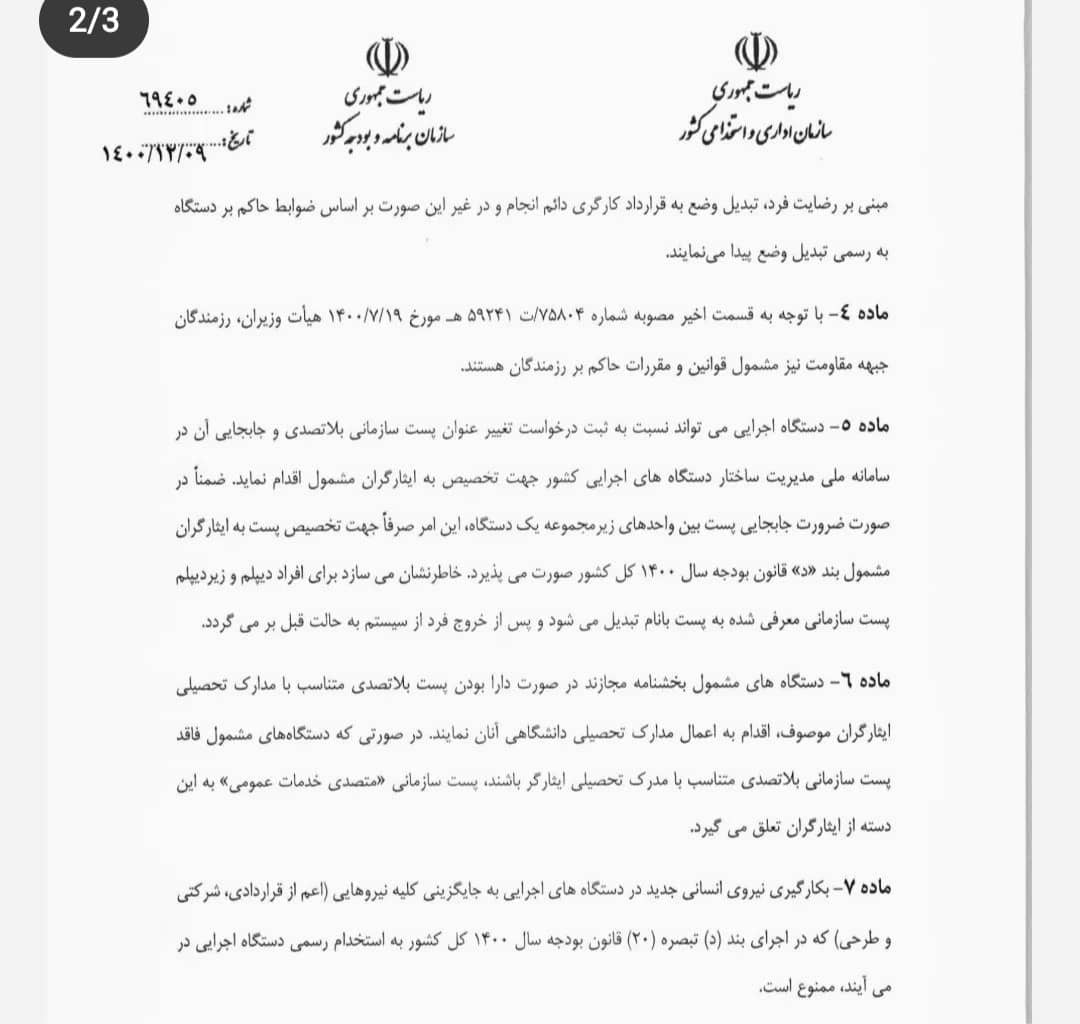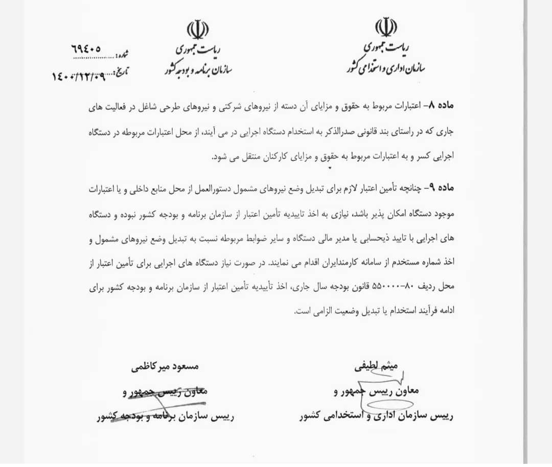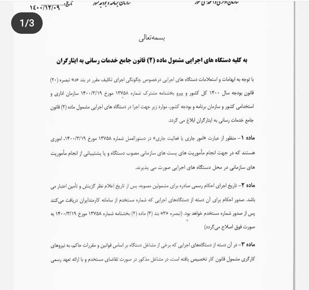 آقا خیلی ها نمیدونم چرا از خودش قانون رو تفسیر میکنه چون دستگاه اجرایی مخابرات شامل نمیشه اولا ایثارگران فقط میتوانند نظر بدهند دوما ماده 8 همین ابلاغیه اشاره به نیروی شرکتی دارد آیا نیروی شرکتی همان مخابرات و سایر نهادها شامل میشود سوما قانون میگه که تمامی دستگاه ها خصوصی نیمه خصوصی که مخابراته مشمول میشود.و چهارم هم اینکه زیاد خودتونو اذیت نکنید مجلس ورود کرده مختص کار مخابرات با ماده 234 کار های لازم رو انجام میده و ایثارگران به زودی حکم خودشان را خواهند گرفت پنجما برید پی این باشید که قانونی که درباره نیروهای قراردادی میخواد به صحن بیاد اونجا پیگیر باشید . ایثارگران اکثرا با سابقه مثل پدر بنده که 23 سال سابقه داره پس همه رو جمع نبند وقتی میخوای حرف بزنی هفتما این کمترین حق ایثارگران طرف پدرش رو از دست داده یا برادرش و….. تو راه انقلاب و این نظام حقشون بیشتر از اینهاست.