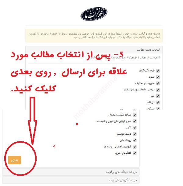 در این ربات خبری, قدرت انتخاب دارید.یعنی می توانید نوع مطالب ارسالی را انتخاب نمایید.هر چند که توصیه میکنیم فعلا انتخابها را محدود نفرمایید.
